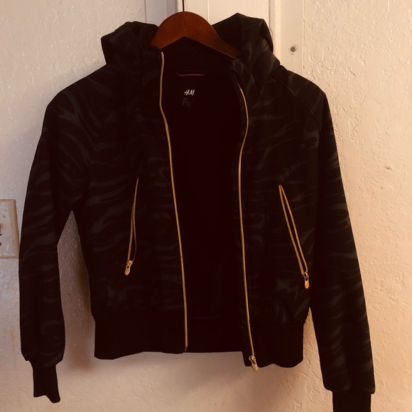 H &M Black jacket with gold zippers and detachable cap size 13/14 Y
