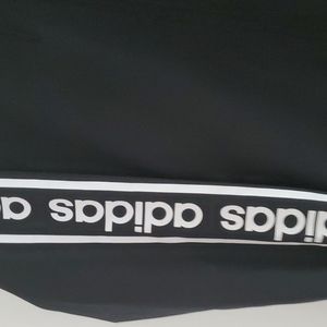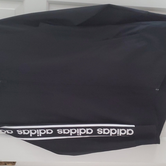 This is a new without tags womens Adidas hooded jacket, size medium. It has pockets, white adidas logo down each arm, hood and dips slightly lower in the back. I am 5'8 and it falls about 9 inches below my waist. Perfect jacket for the fall!