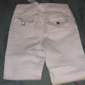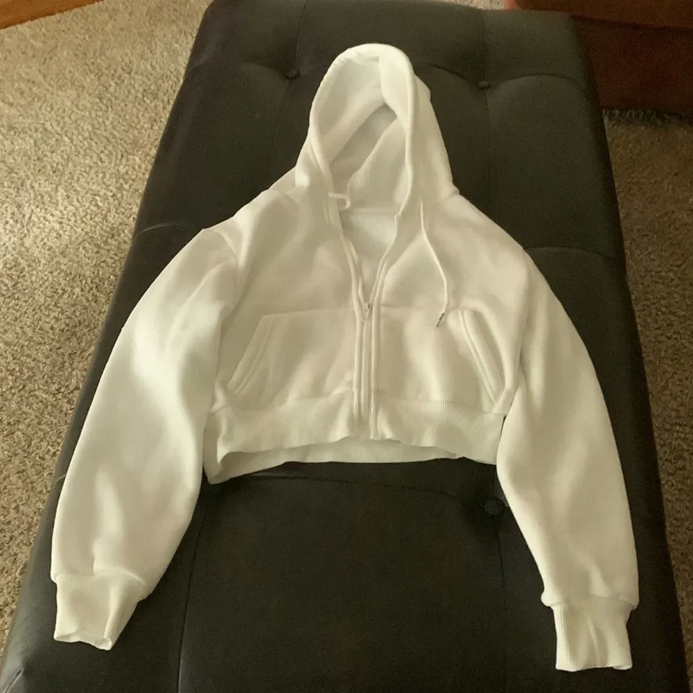 White hooded waist length jacket. White jeans are free. They are a size 12 in kids.