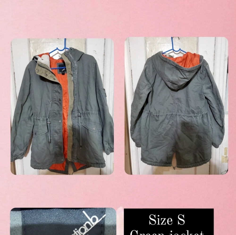 green jacket with waistband and orange detail in the inside