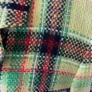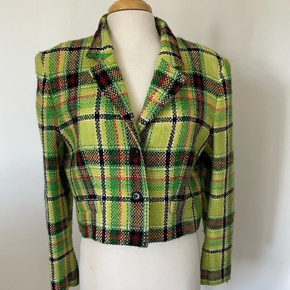 Wool blend plaid jacket, 2 button closure, pockets. 19” in length. 60% wool, 20% rayon, 12% nylon, 8% cotton. Fully Lined.