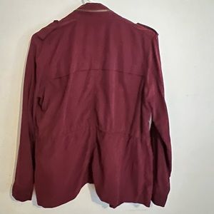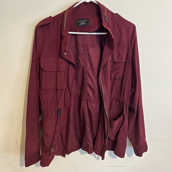 Maroon fall light jacket with adjustable waist, zipper, pockets