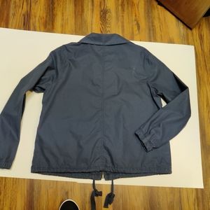 Light-weight navy blue unlined jacket. Draw-string hem, elastic at wrist, zipper pockets