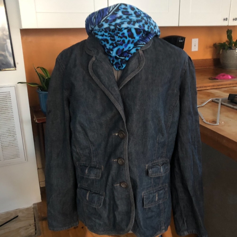 Denim blazer with pockets in a dark blue, charcoal wash. Denim is at its peak . Wear casual or updated for a more look formal look.