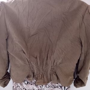 Versatile crinkled faux suede jacket with bronze detail at shoulder