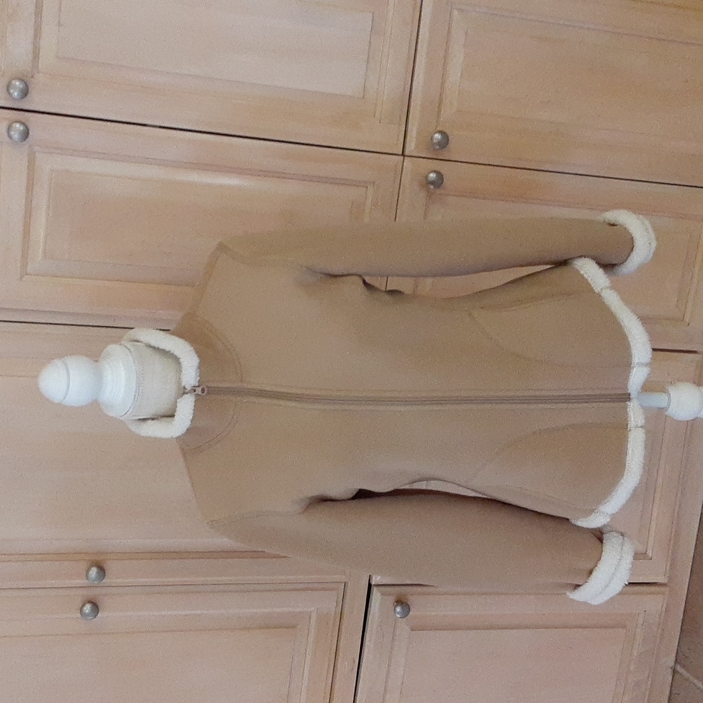 the brand is Faded Glory, size small. made in China. color is tan with white interior. 2 pockets,zipper, sleeves can be rolled up or left down. Smart looking for cooler days without a lot of bulk. Sleeve length is 23 and a half inches. Is polyester.