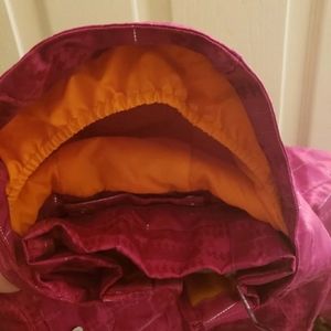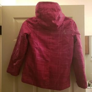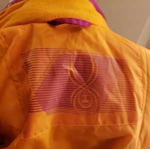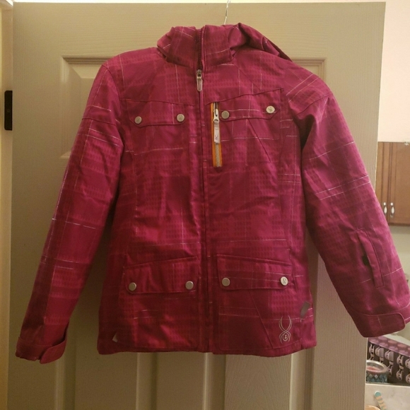 Hot pink Spyder ski/ snow jacket. Very warm insulated hot pink with silver detail spiders with bright orange inside. Pocket on left sleeve has velcro closure. Zip pockets in front. Belt secure with elastic on inside. Mesh inside pocket on left and velcro pocket inside on right. Hood can be detached from jacket with snaps.