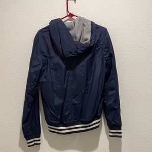 Blue zip up jacket. Windbreaker material on the outside. Soft on the inside.