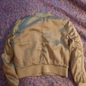 scrunched arms, snug fit. feels like silk there is a small section of a few brown spots can even tell will probably come out at dry cleaning