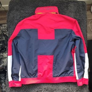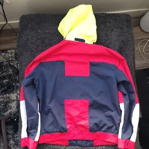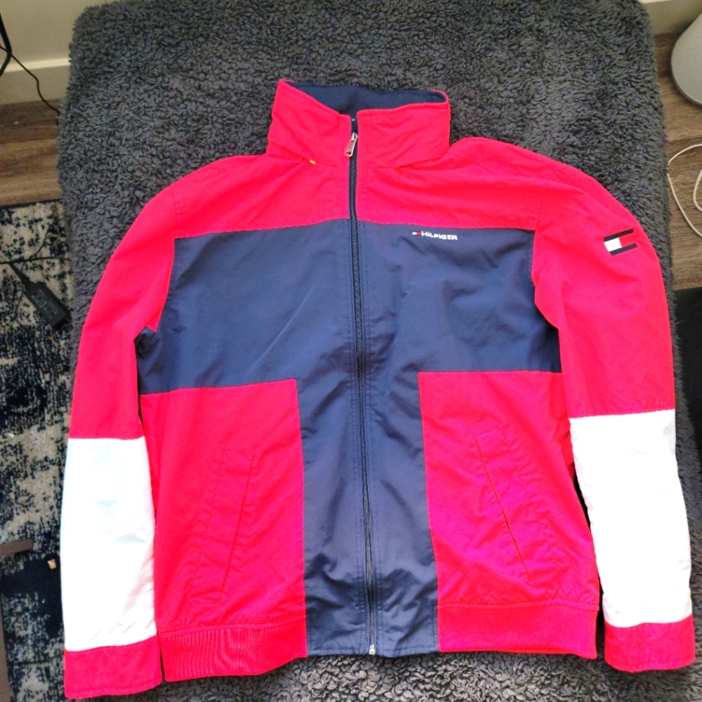Tommy Hilfiger Lightweight jacket with hidden hoodie. Has a T on the front & a H on the back. 2 side pockets and a zipper closure for the jacket. I am 278 lbs. and 6'4 and fits me fit with no problems.