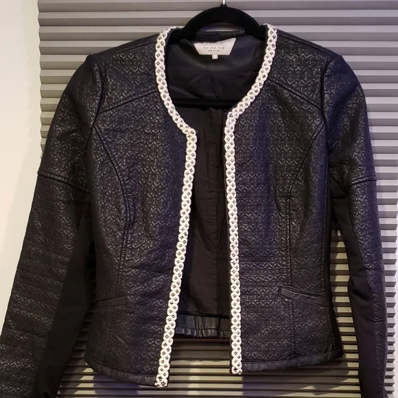 Vegan Black Leather jacket with white trim. Looks and feels luxurious worn once (Like New)