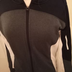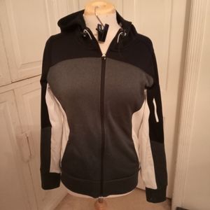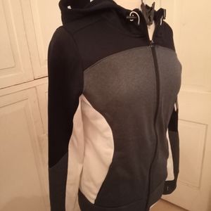 New black,gray and white jacket with a hood and pocket on side of the arm