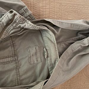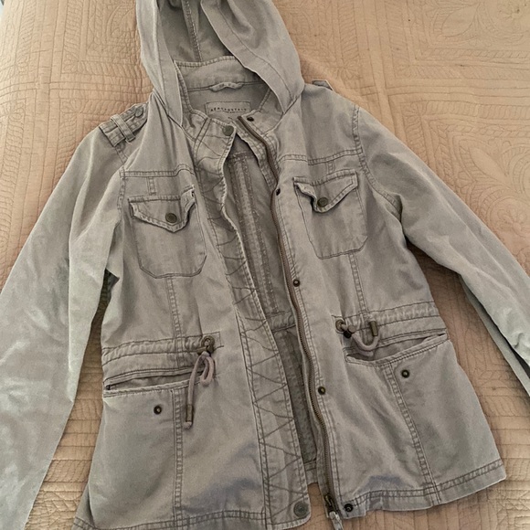 This jacket is from aeropostal. Size medium buttons and zips up. Adjustable waist string. Smoke free only wore a hand full of times never wanted to destroy it.