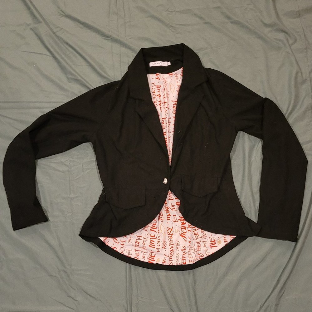 slim fitting black jacket with suede-like fabric. gold button detail and red/white lining.