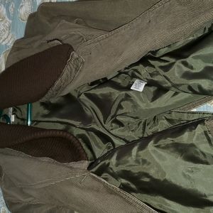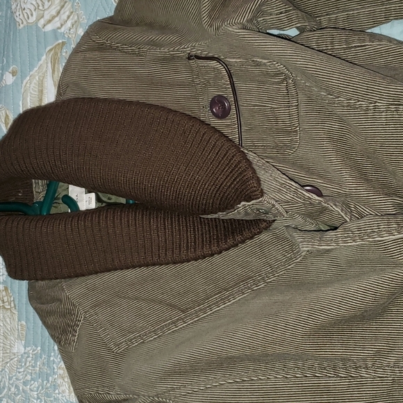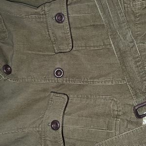 EUC Olive green corduroy jacket Brown fabric around the collar 3 pockets 1 upper left 2 on bottom each side belt with loops