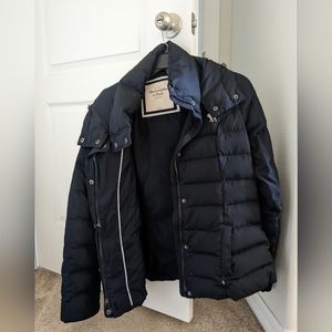 Size Large. Lightly used and has been in storage for some time. Missing the fur hood attachment. Besides that, no damage to the jacket. Jacket comes with a belt included.