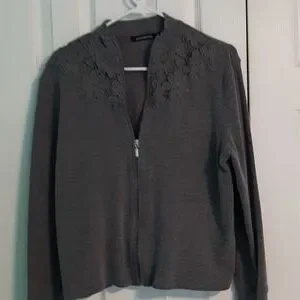 grey knit jacket with zipper front and floral design around neck with pockets