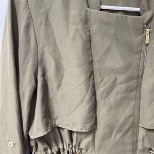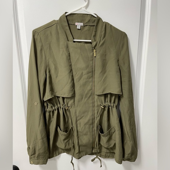 Olive green. Zippers in the front. Drapes. Thin material. Can be worn as a shirt.