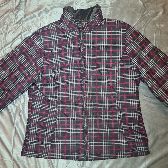 Grey and pink lightweight jacket. Fleece and polyester lining. 2 pockets, working zipper. Size XL, but it seems smaller to me, maybe like a Medium or Large. Perfect condition.
