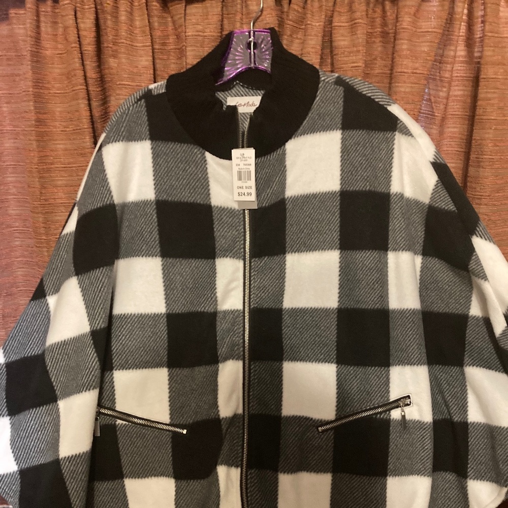 Black and white buffalo plaid cape style jacket. One size fits all. New with tags, never worn.