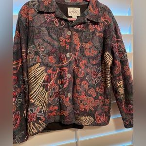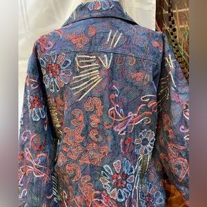 Chico’s Size 2 multi-colored embroidered jacket. This jacket has breast pockets and looks just as gorgeous worn casually with jeans or dressed up with that special black dress. Arm length 23” with button closure at the wrist. 100% Cotton Shell and 100% Polyester Lining. Appliqué 100% Cotton with Embroidery Thread 100% Rayon. The nature of the material with the appliqué and embroidery lends itself to have a fray look.