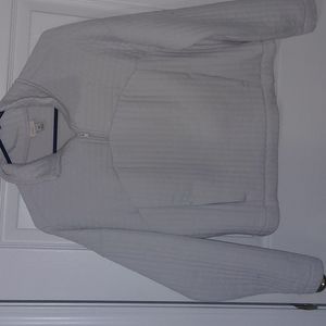 looking for a warm workout jacket? This is it! It's wonderful for jogging, biking and yoga. It's off white, feels like a thin quilt material (made to keep you warm but not too hot), and two pockets in case you need them. They were all made to be a little short however, it's not like a normal crop top shirt. It does have some lent where it has been washed but no stains, tears, holes.