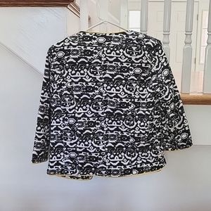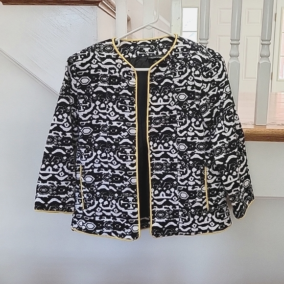 Very nice condition. Black and white pairs well with so many colors. Has yellow piping for a beautiful embellish. The sleeves fitted me at 3/4 length. Has 2 front pockets. Measurements are in pictures. please ask if you need more information. From smoke and pet free environment. I will bundle items for shipping.