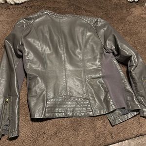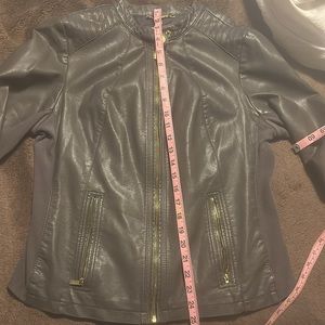 Pictures the jacket has been worn and has a tiny dot or so on the inside of the jacket right side (shown in pictures). You cannot see it on the outside. Nothing else is wrong with the jacket and it zips. Cute with jeans and boots or however you like it. 💕