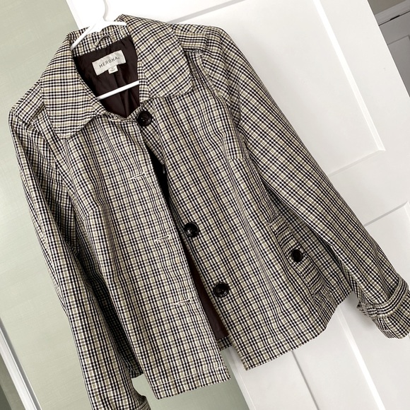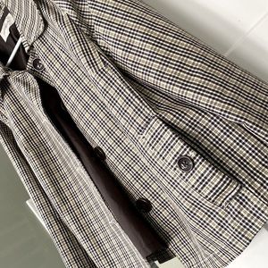 Light weight, lined jacket. Back pleat for easy movement, 4 button closure and sleeves have fun buckle detail. Two from side pockets. Colors are navy, black and green plaid.