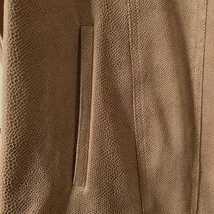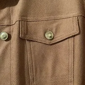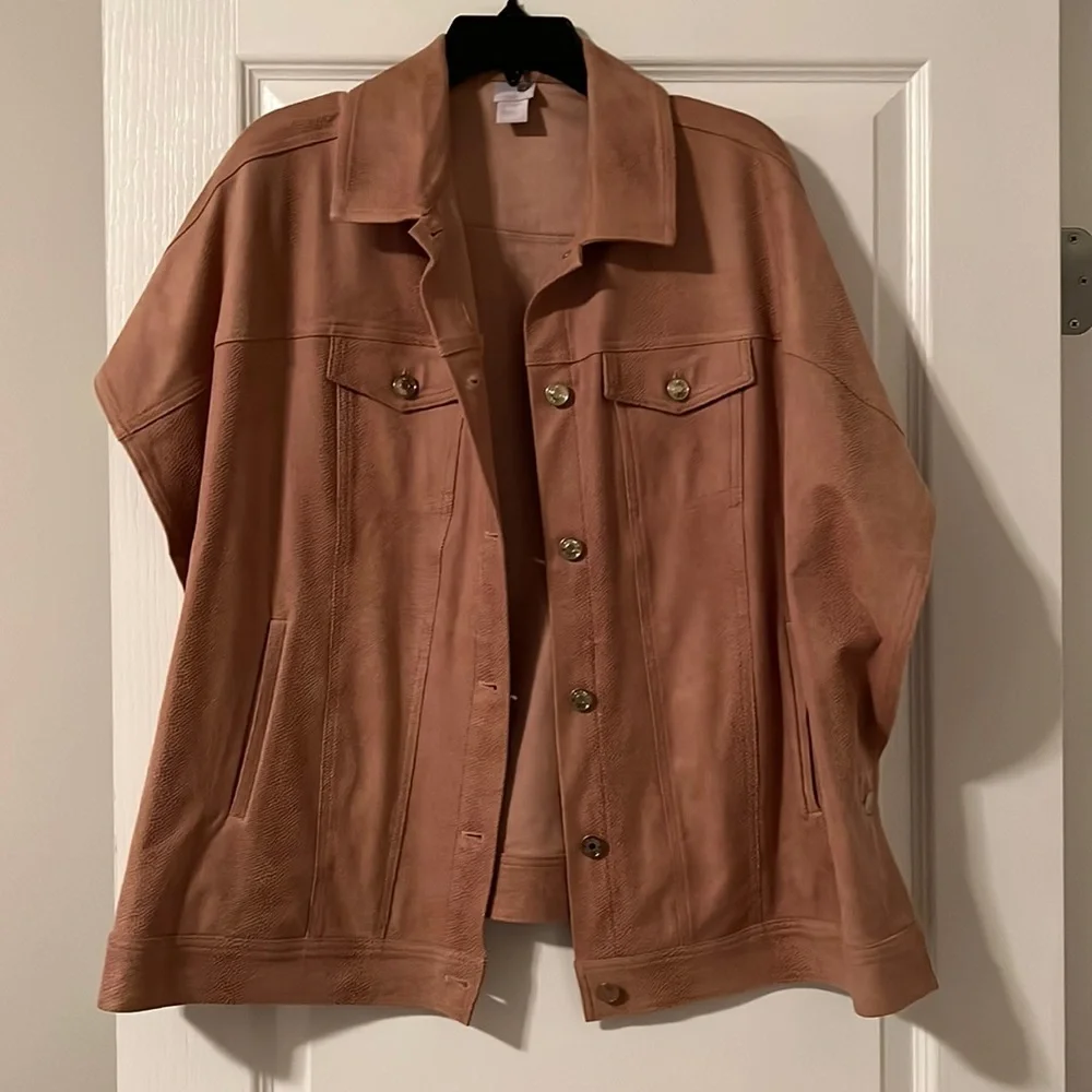 Mauve pink suede textured poncho Jacket. The poncho jacket has two pockets at the top and two side pockets. The poncho jacket buttons in the front with five silver buttons. The poncho jacket has no sleeves and one button on the side. The jacket has only been worn once.