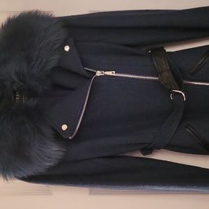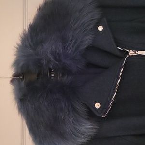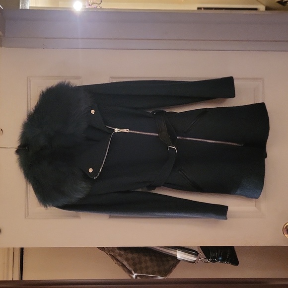 This is a guess jacket with removable faux Fur color and double sided belt.. It's a beautiful dark Kelly green and it is brand new without tags never worn..