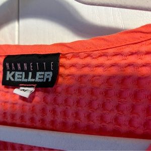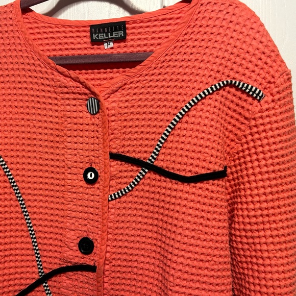 Lightweight coral waffle textured jacket with stunning black accents. Adorable buttons. New condition.