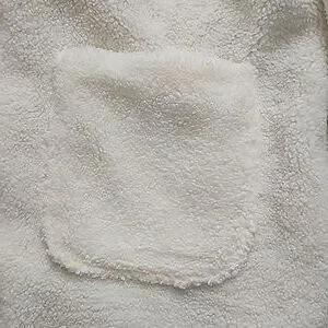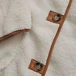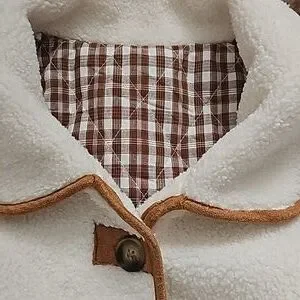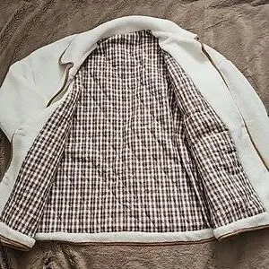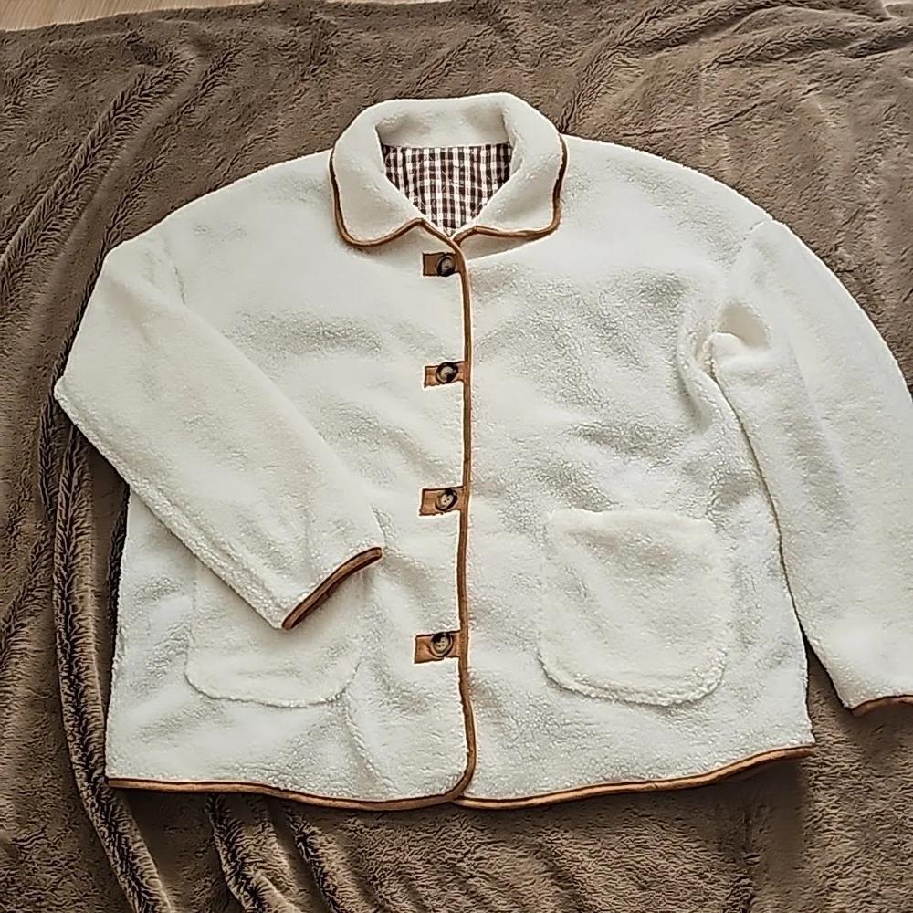 adorable cream fleece jacket lined in brown plaid, trimmed with tan colored faux suede around buttons hem cuffs collar, two front patch pockets, brand new never worn Size XL with an oversized fit