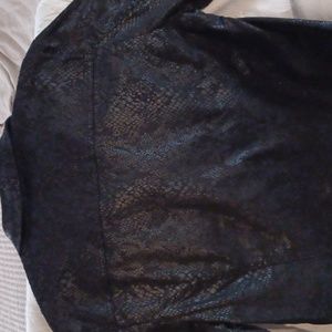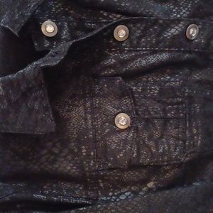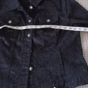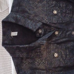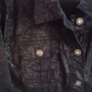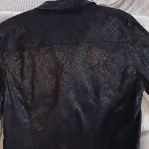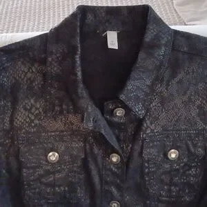 xl, rich black snake print, shimmer in fabric snake print. beautiful buttons, extra inside pockets on both sides, 97%cotton,3% spandex, nice stretch. removed tag with brand.