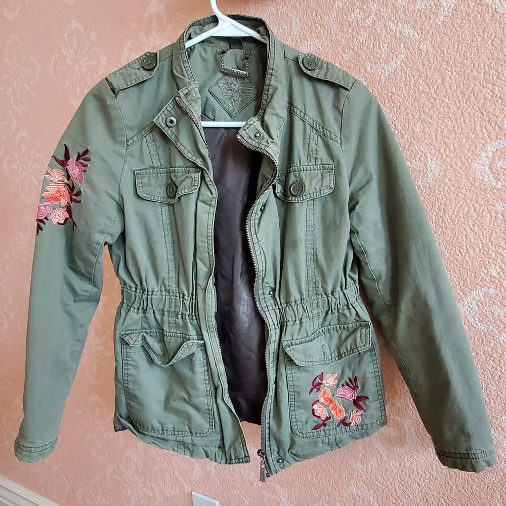 Boho comfortable, stylish army green denim jacket with embroidered flowers.