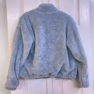 More furry than Sherpa but it’s really nice and warm. It’s a cool light blue. A bit greyish too. Has pockets!