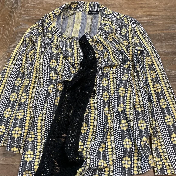 Black, white, yellow sweater with black fringe