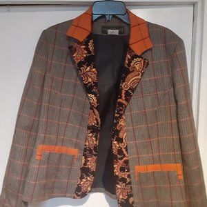 Wool,stylish,patterned,tailored fit. Orange collar with red and black stripped accents.