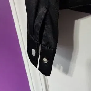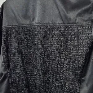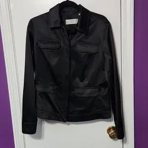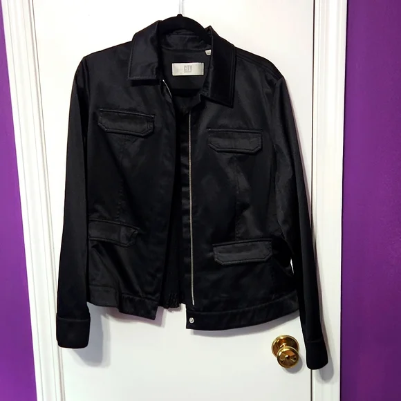 City DKNY jacket has a Satin feel but is cotton/polyester. 4 front pockets with flaps. Snaps at the cuffs. Elastic at the back. Great condition
