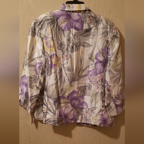 Print spring jacket with pockets works great with a pencil skirt or pants with a sheen to it. Size 18 new with tags