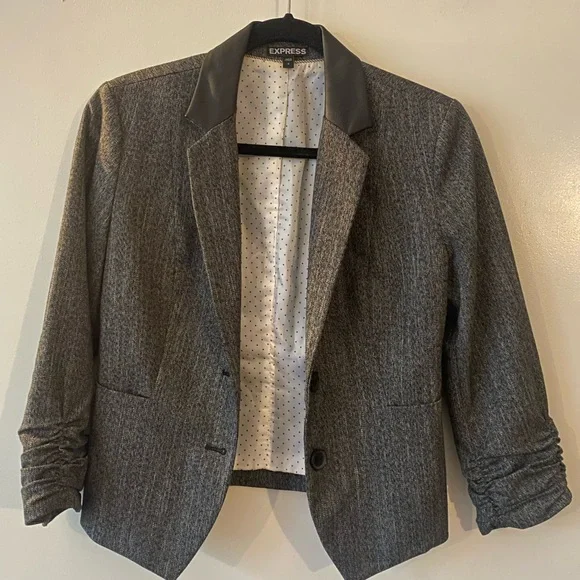 3/4 sleeve black and white jacket with imitation leather collar. Easy to dress up or dress down
