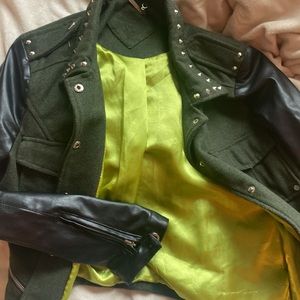 Lined jacket with zipper on sleeve along with stud embellishments. Pleather black sleeves. Waist length