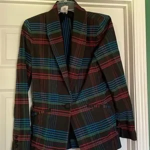 Black Jacket with red, blue, and green stripes. Brand: Cabi, size: medium