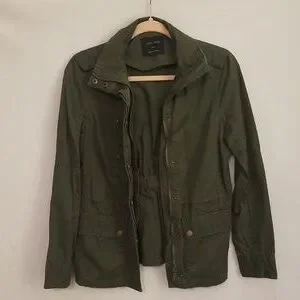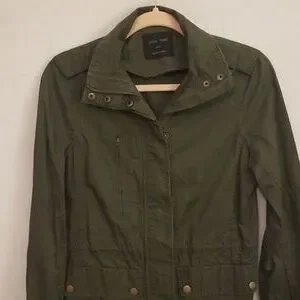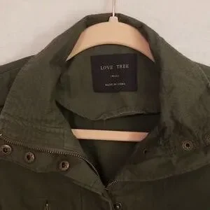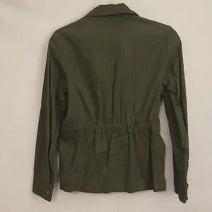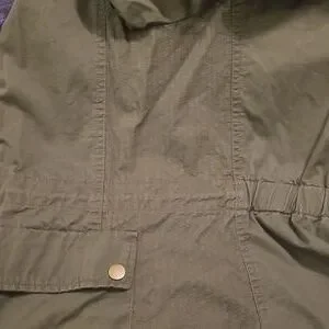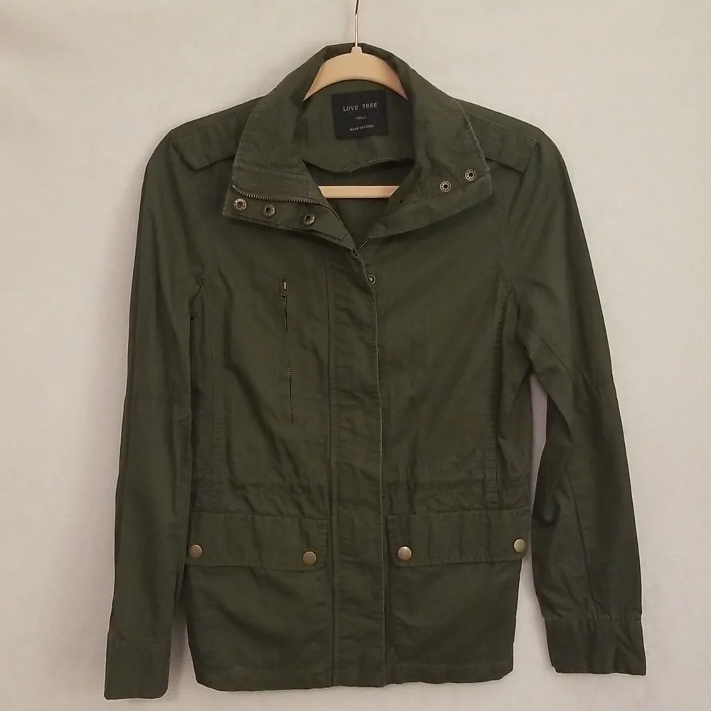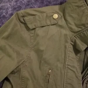 small jacket, Love Tree, dark army green color, lightweight, 100% cotton, brand new never worn, lots of detail, zippers, buttons, front drawstring at waist, back elastic at waist, panel detail at sides under arms and collar, shoulder button detail.