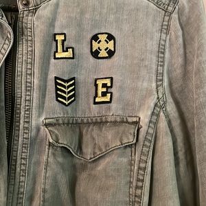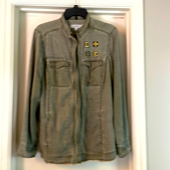 Army green jacket. Zips up, 2 front pockets and sleeves snap - Soft cotton