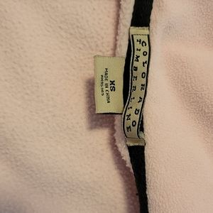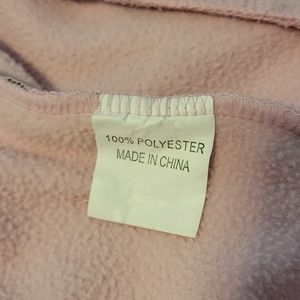 Lightweight pink jacket with two pockets and draw strings at bottom of jacket.