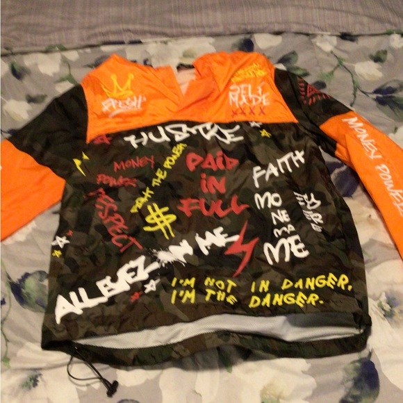 Orange and camo color windbreaker jacket with hood and kangaroo pouch. Like new