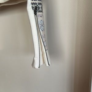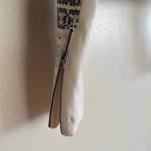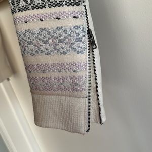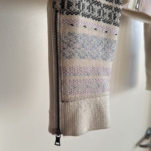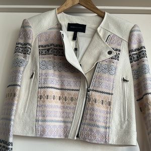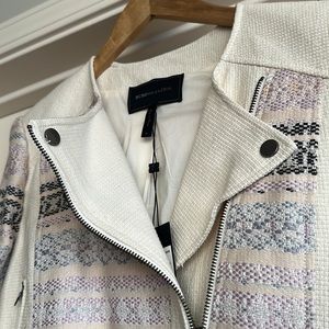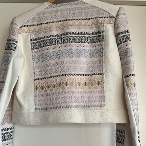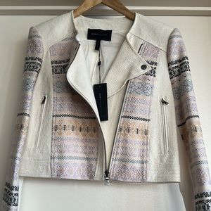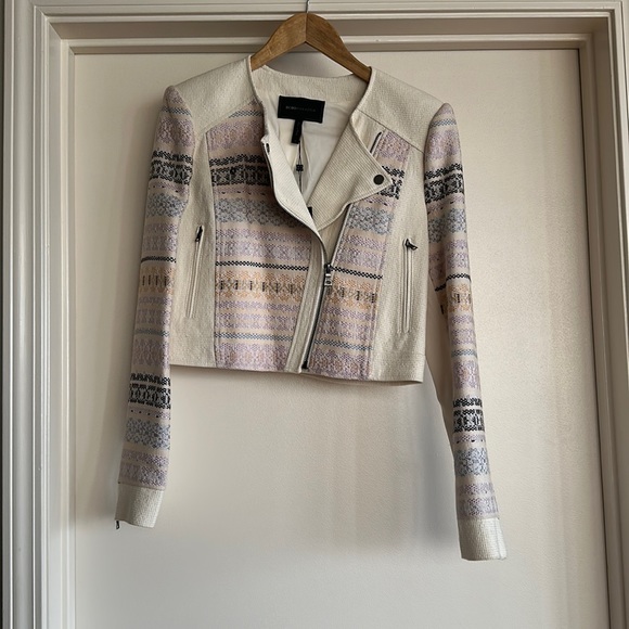 A crop jacket with zippers on the front & pockets on the side with zippers on the sleeves with a button at the top of the jacket different colors throughout the jacket