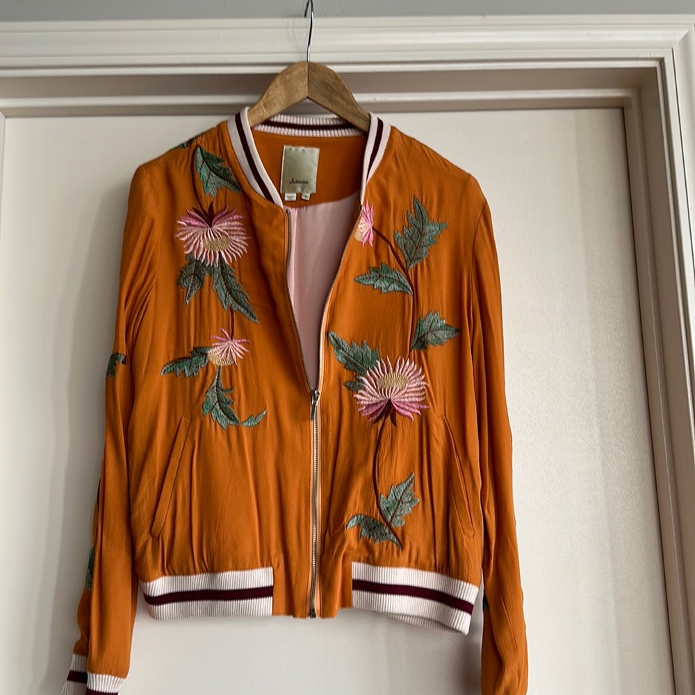 Flower jacket with pockets on the side with a zipper up the front color mustard gold green pink cream burgundy’s little yellow throughout the jacket