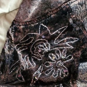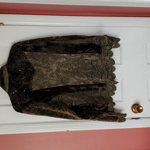 This is a beautiful velour jacket with many details. It has tapestry, a few sparkles